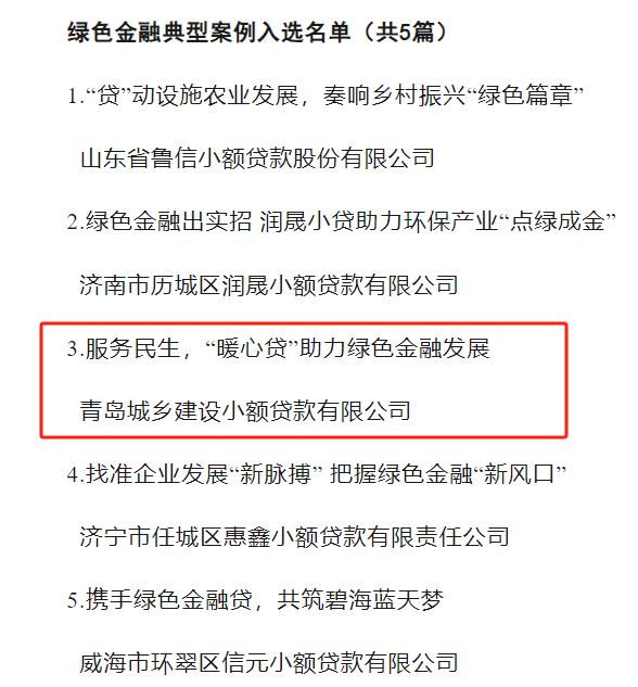 近期,山東省小額貸款企業協會發布《做好“五篇金融文章”助力地方發展案例榜單》,青島城投城金集團旗下城鄉小貸公司暖心貸、產融e貸兩項業務分別入選綠色金融典型案例、數字金融典型案例。