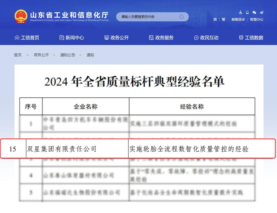 近日,山東省工業和信息化廳公布2024年全省質量標桿典型經驗名單,雙星集團“實施輪胎全流程數智化質量管控的經驗”案例成功入選,成為輪胎行業唯一入選企業,彰顯了雙星在數智化質量管理中的示范引領作用。