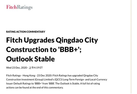 惠譽國際評級12月23日正式宣布,確認集團長期外幣及本幣發行人主體評級從“BBB”上調至“BBB+”,展望“穩定”。惠譽認為,集團與青島市政府的關系進一步加強,將代表政府持有更多具有戰略性的重要資產。
