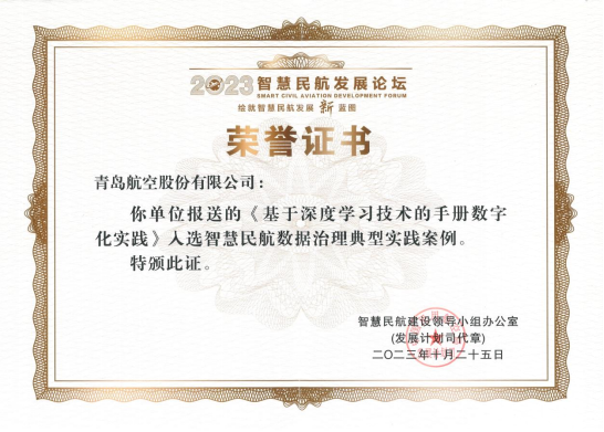 青島航空榮獲“智慧民航典型案例”