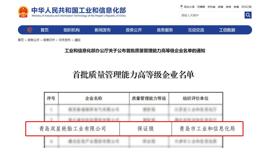 行業唯一!雙星輪胎入選工信部質量管理能力高等級企業名單