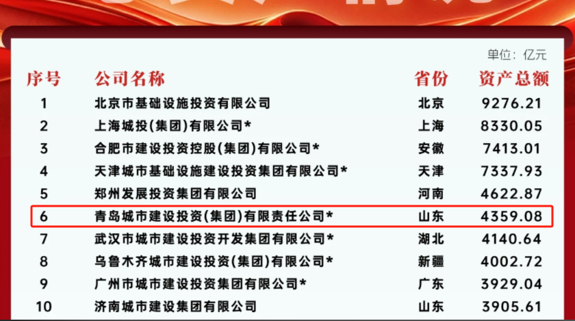 青島城投榮登全國(guó)城投公司收入榜第5名