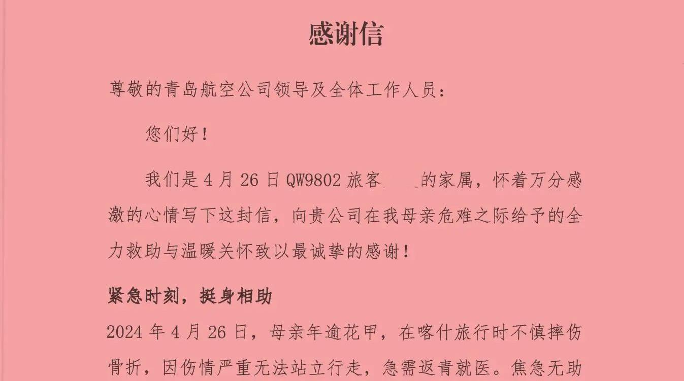 近日,一封含“贊”量滿滿的感謝信被專程送到了青島城投集團(tuán)旗下青島航空的值機(jī)柜臺(tái)。信中,旅客家屬用“雪中送炭的人間大愛”形容這段跨越千里的護(hù)航之旅,字里行間流淌的真情,讓這封不足千字的信件成為青島航空真情服務(wù)的最佳見證。(圖為乘客發(fā)來感謝信)4月26日,年逾花甲的旅客萬女士在喀什旅行時(shí)不慎摔傷骨折,因傷情嚴(yán)重?zé)o法站立行走,需搭乘青島航空QW9802航班返青就醫(yī),家屬在焦急無助之際聯(lián)系青島航空求助。接到旅客求