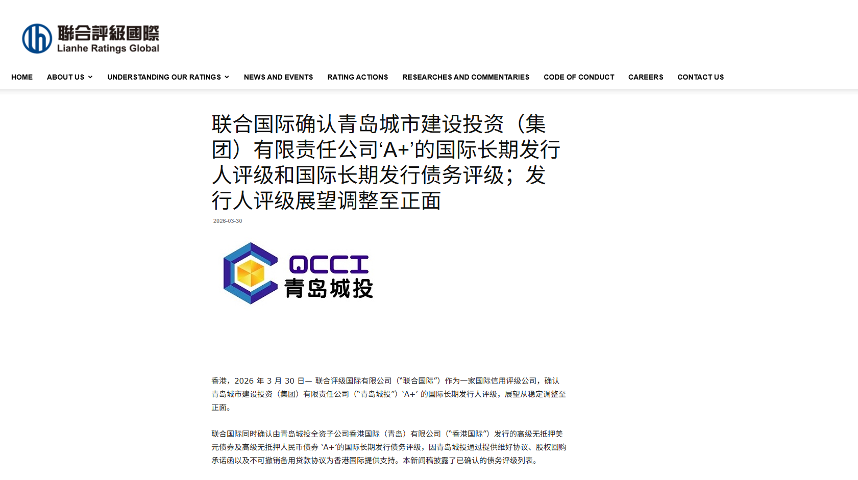 青島城投集團再獲聯合國際“A+”境外主體評級
