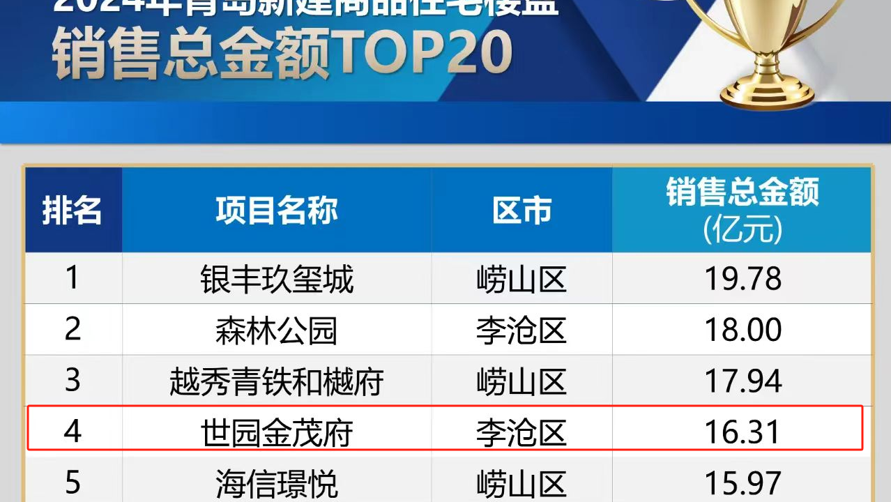 近日,2024年青島市商品房銷售榜單正式發布,青島城投集團世園·金茂府項目以16.31億元銷售總金額榮登2024年青島新建商品住宅樓盤銷售金額榜第4名,超額完成全年銷售目標任務。(圖為青島銳理數據截圖)世園·金茂府是青島城投集團與金茂集團聯合打造的標桿型人居產品,占地160畝,規劃地上建筑面積20.89萬平方米。項目自2023年1月開盤以來,便備受市場關注。(圖為世園·金茂府項目)項目位于4A級景區世博園內,對望百果山,五縱