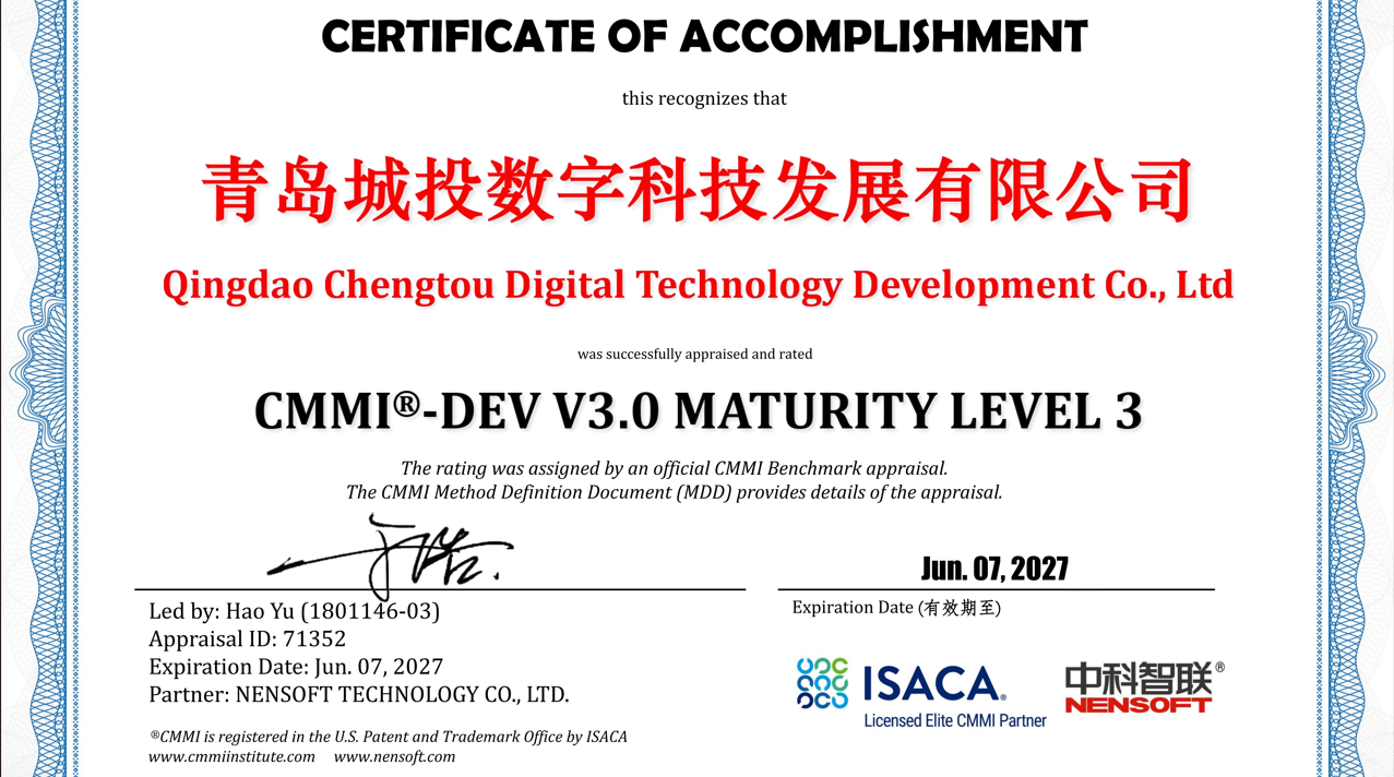 近日,青島城投集團旗下數科公司憑借在項目管理及信息技術服務領域的卓越表現,順利獲得“CMMI 3級”與“ITSS 3級”認證,標志著數科公司在軟件研發管理與信息技術服務標準化方面邁上了新的臺階。(圖為CMMI3級證書)CMMI(Capability Maturity Model Integration,能力成熟度模型集成等級)是全球軟件業最權威的評估體系之一,旨在幫助企業提升軟件產品開發及過程管理的成熟度。獲取了該項資質,表明數科公司在項目策劃、執行監