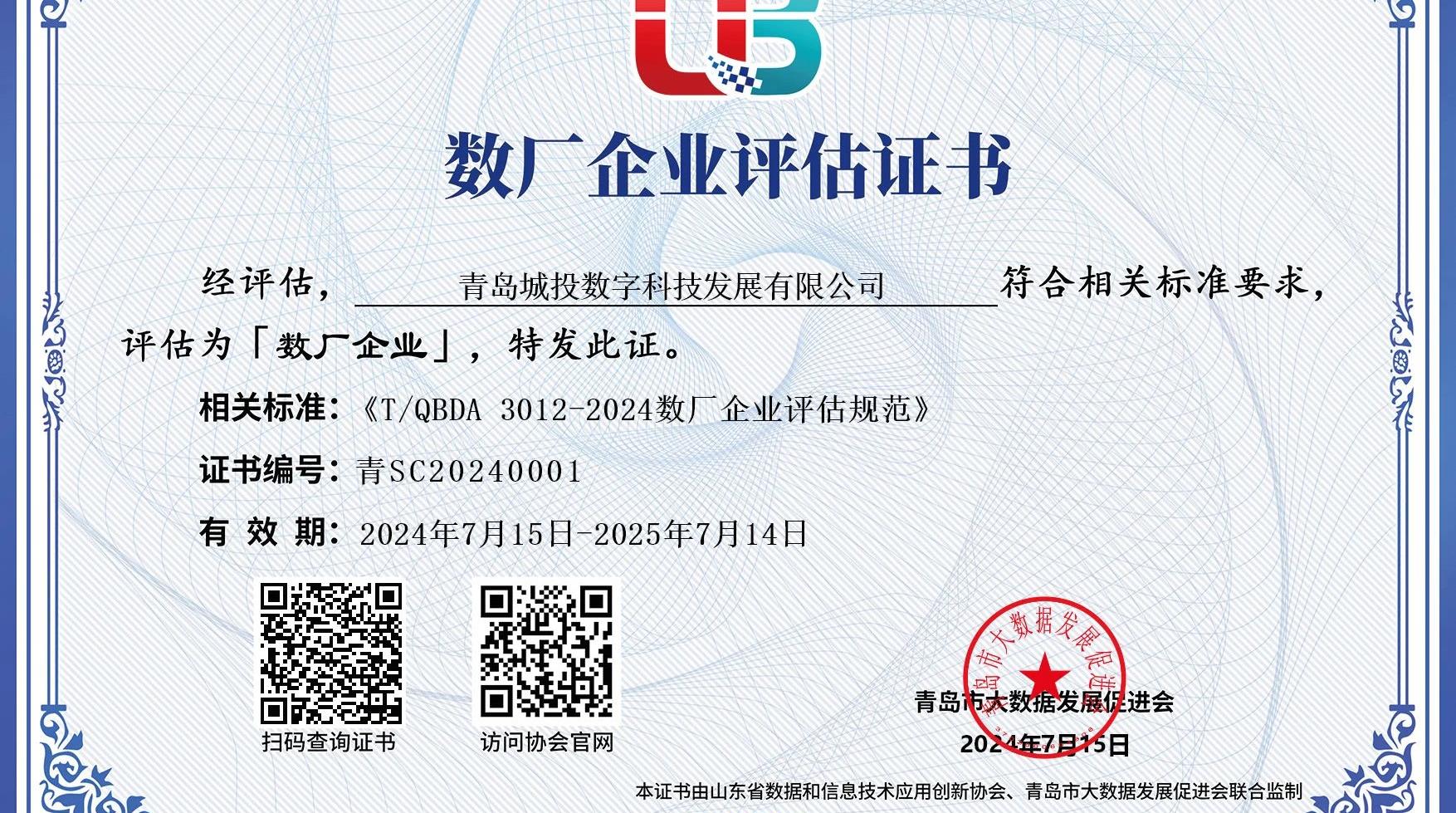 青島城投集團(tuán)旗下數(shù)科公司榮登2024年青島市首批“數(shù)廠(chǎng)企業(yè)”名單