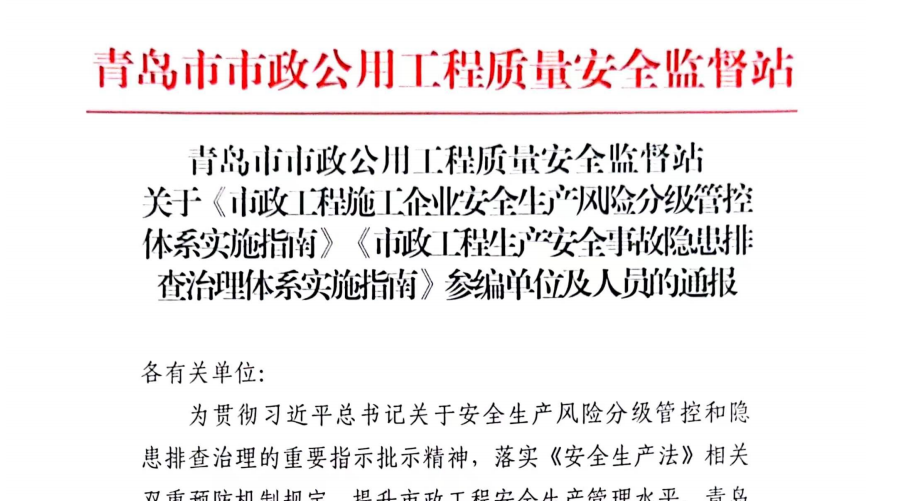 “標準決定質量,有什么樣的標準就有什么樣的質量,只有高標準才有高質量。”青島城投集團深入學習貫徹習近平總書記關于安全生產、標準化工作的重要論述精神,近日,城投集團與青島市市政工程質量安全監督站共同主編兩項省級行業團體標準《市政工程安全事故隱患排查治理體系實施指南》(以下簡稱《隱患排查指南》)《市政工程施工企業安全生產風險分級管控體系實施指南》(以下簡稱《風險管控指南》),已正式發布實施。(圖為兩